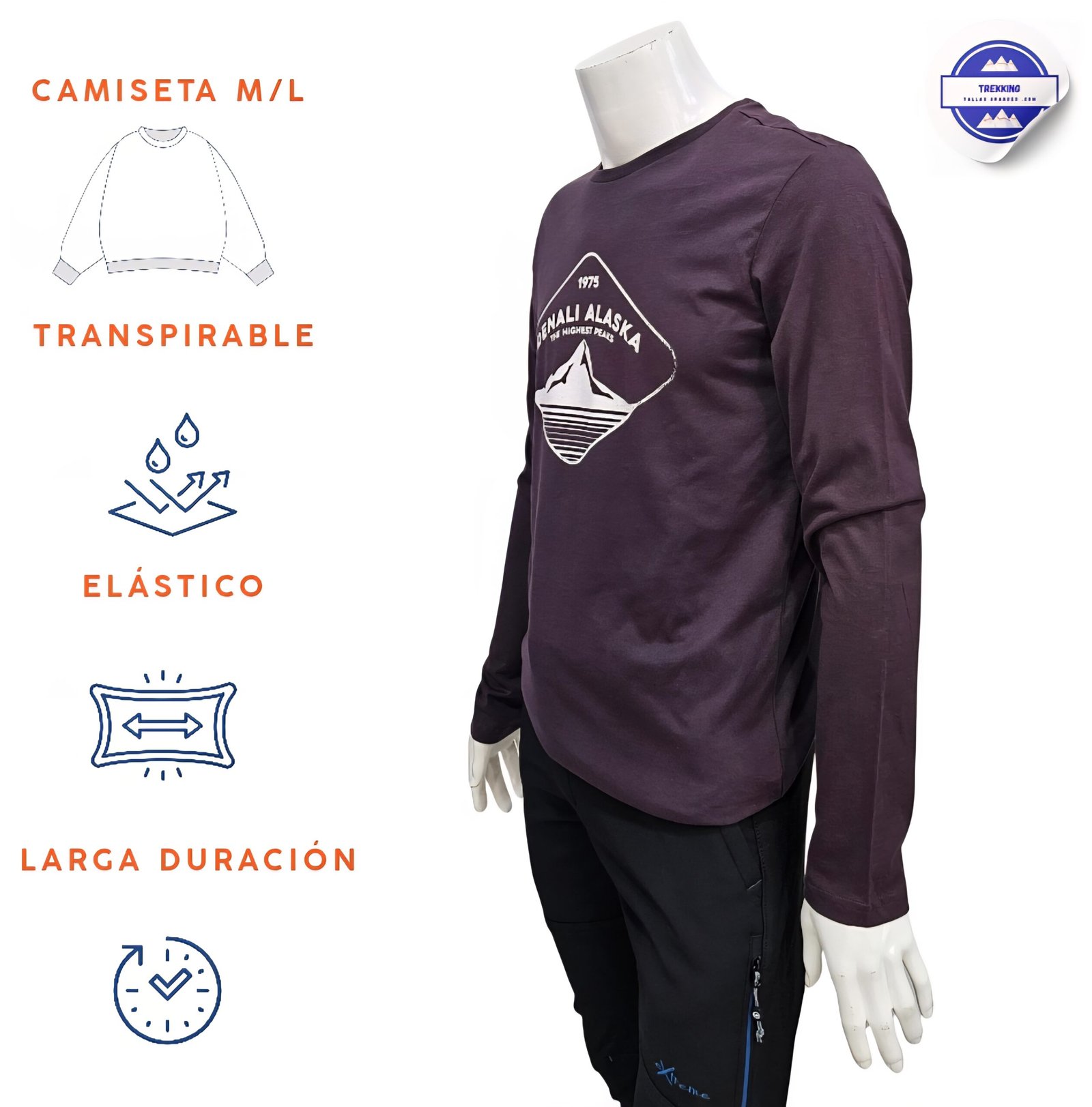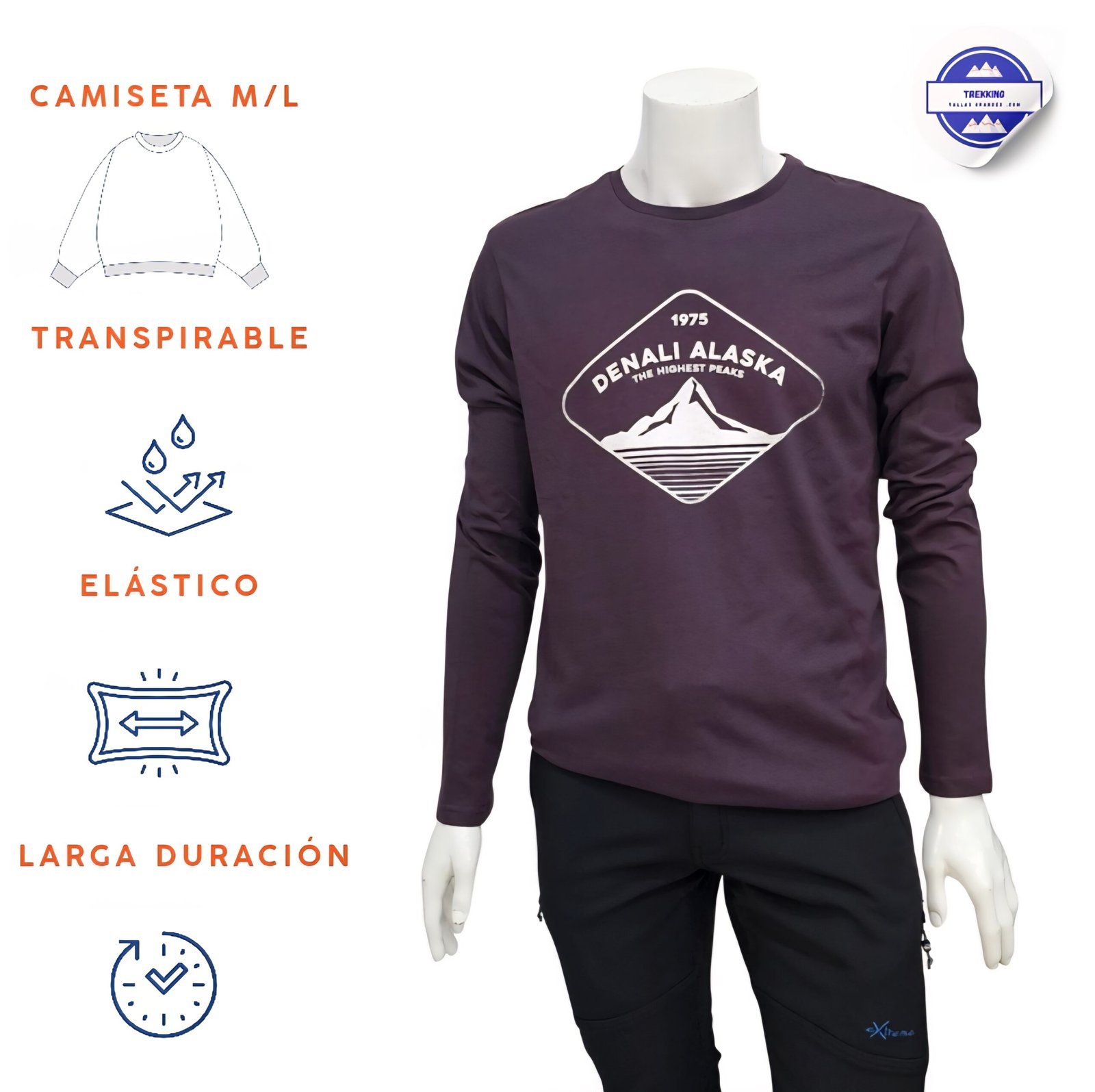 La camiseta manga larga hombre losan color vino con serigrafía central 1975 denali alaska une estilo actual, personalidad y comodidad diaria. Su diseño destaca por un gráfico centrado con aire aventurero que llama la atención sin exagerar. Además, el tono vino aporta un punto diferente al básico clásico, manteniendo una estética fácil de combinar.