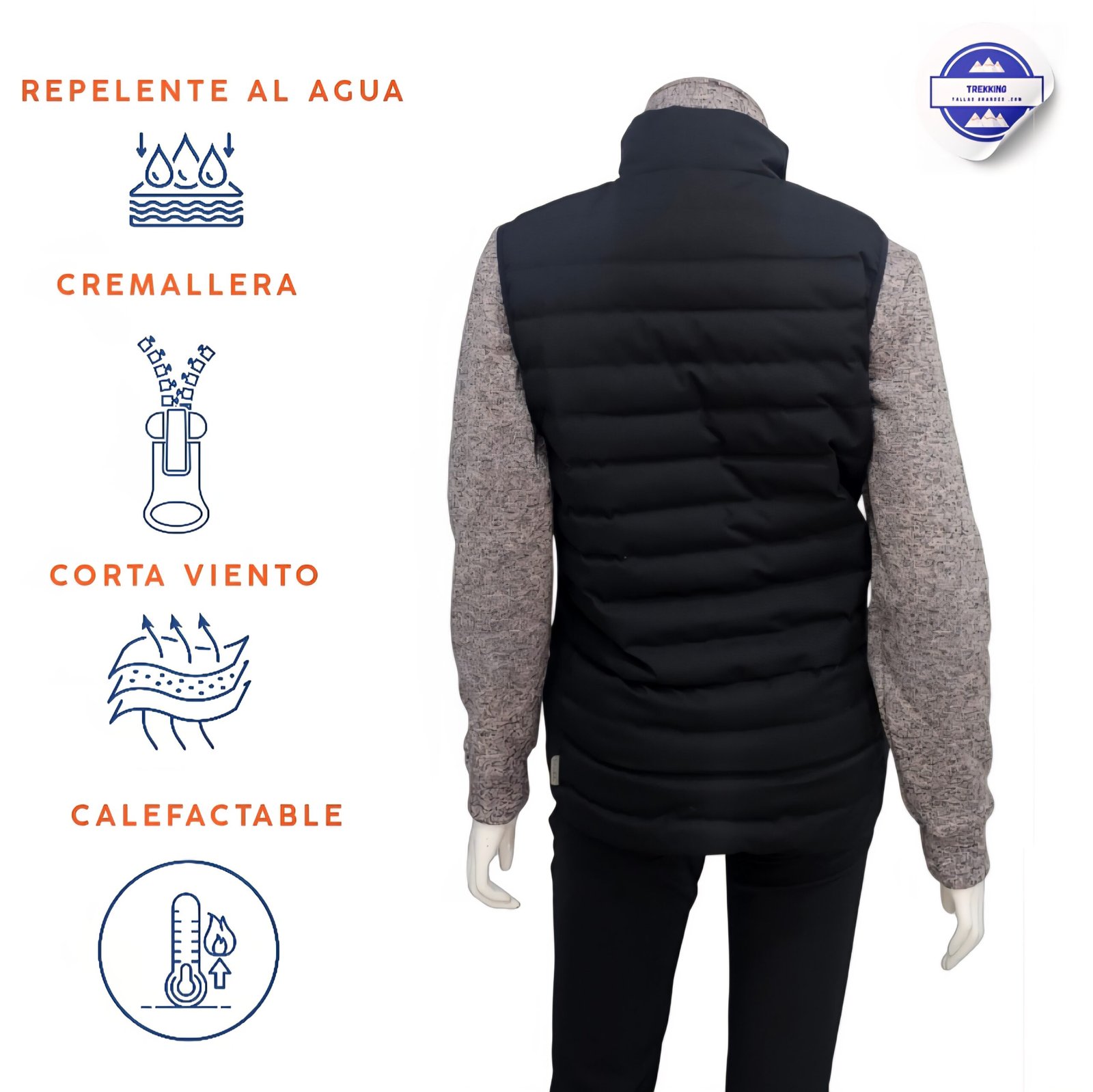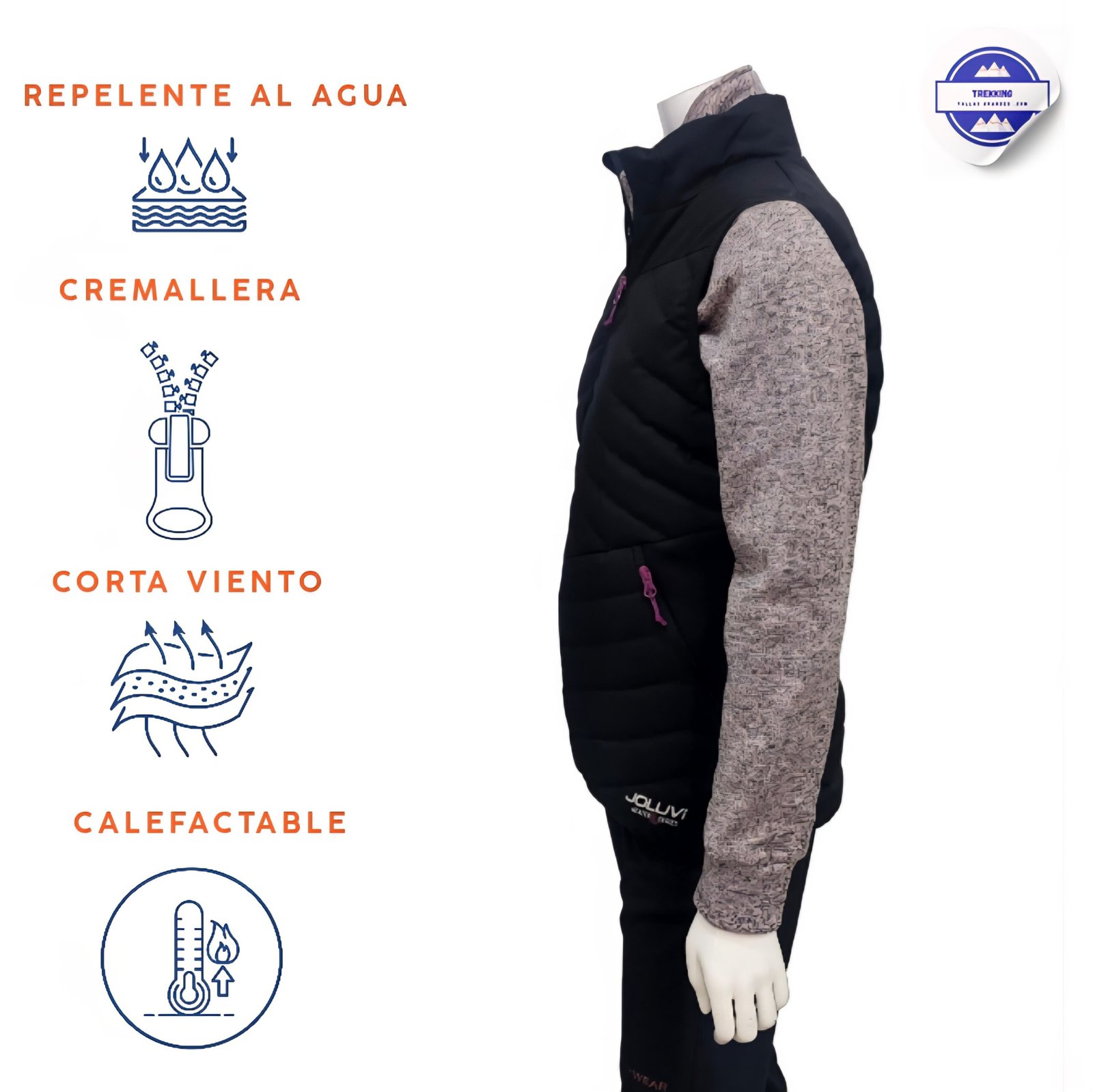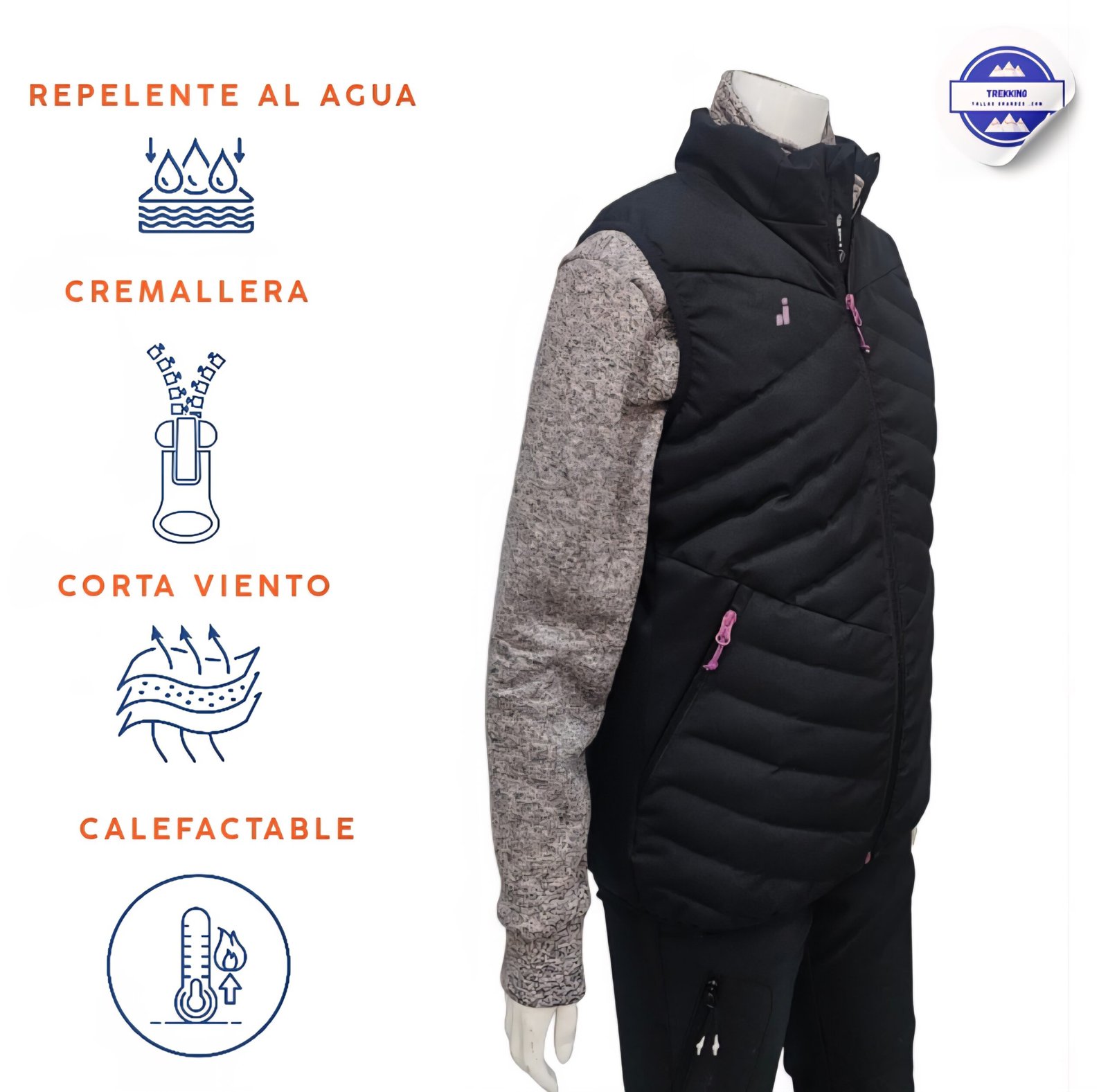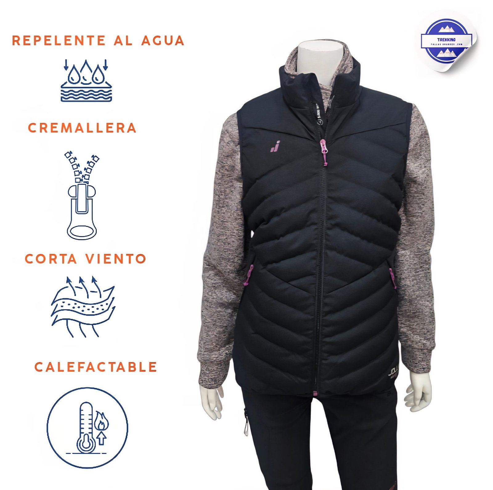 Fabricado con materiales de alta calidad, su exterior y forro son 100 % poliéster, garantizando resistencia, ligereza y aislamiento térmico. El cierre central con cremallera proporciona un ajuste seguro, mientras que su diseño femenino realza la figura sin sacrificar movilidad.