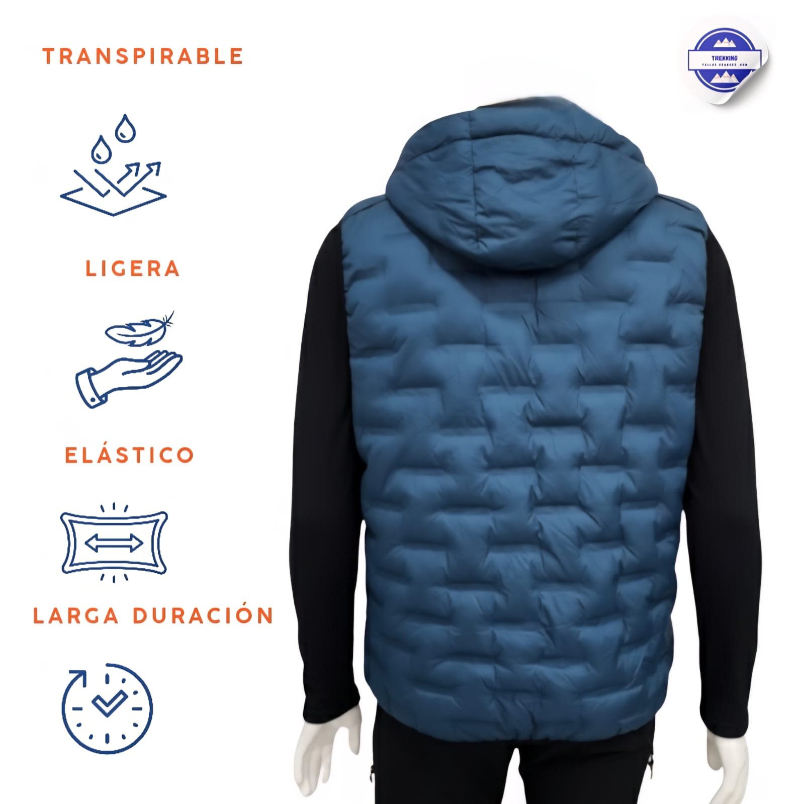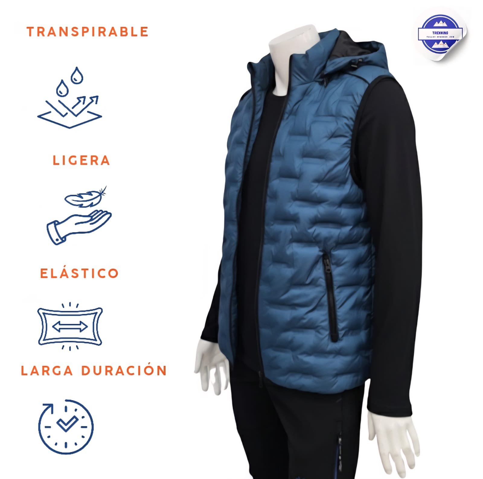 PREPÁRATE PARA EL FRÍO CON UN BÁSICO TÉCNICO Y CÓMODO. Este chaleco acolchado para hombre combina aislamiento ligero, libertad de movimiento y un diseño pensado para el día a día. La capucha desmontable y la cremallera termosellada te protegen del viento y la humedad, mientras el color azul índigo aporta un toque moderno y fácil de combinar en cualquier look casual.